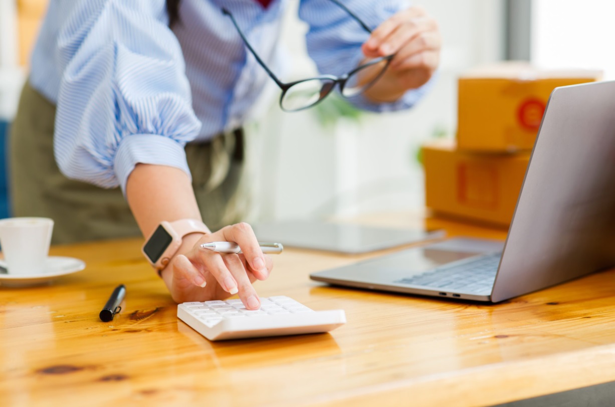 Une femme avec un PC et une calculatrice